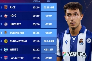 体育资讯7月6日讯 阿森纳官方宣布祖比门迪加盟,转会费6500万欧,德转也盘点了阿森纳队史引援花费榜,祖比门迪位列第4,以下为具体榜单: