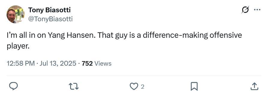 其中美记Tony Biasotti在末节发文:“我全力支持杨瀚森,他是一名可以改变比赛家伙”。