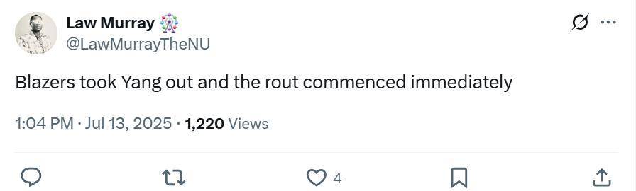 快船记者Law Murray则更加一针见血的指出:“开拓者一换下杨瀚森就开始崩盘了”。