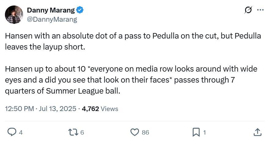开拓者队记Danny Marang则专门称赞了杨瀚森的传球,直言像那种让替补席目瞪口呆的传球,杨瀚森已经传出了10次,可惜队友的终结有些差劲。